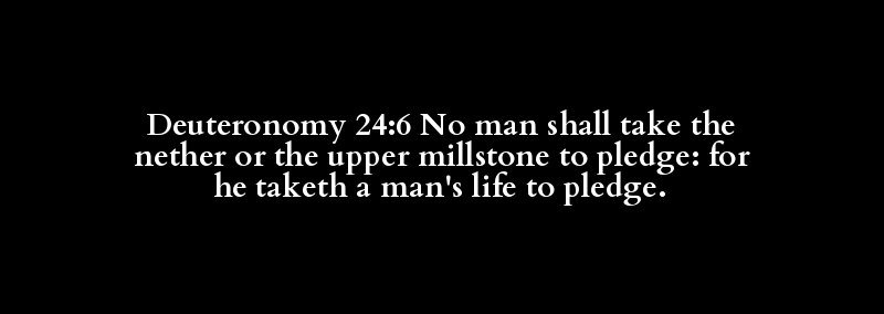 Deuteronomy 24:6 No man shall take the nether or the upper millstone to pledge: for he taketh a man's life to pledge.