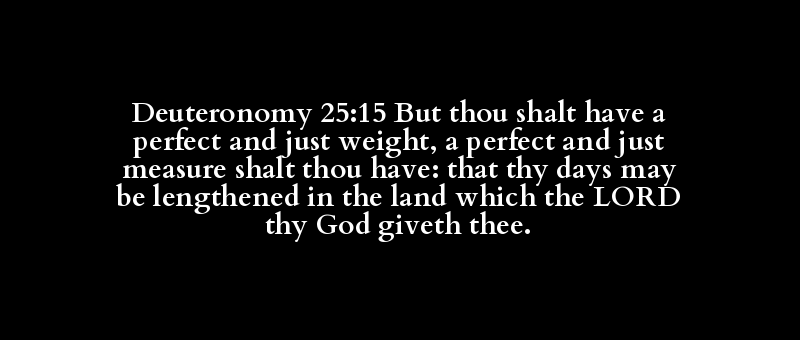 Deuteronomy 25:15 But thou shalt have a perfect and just weight, a perfect and just measure shalt thou have: that thy days may be lengthened in the land which the LORD thy God giveth thee.