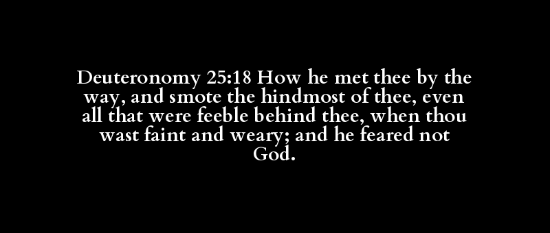 Deuteronomy 25:18 How he met thee by the way, and smote the hindmost of thee, even all that were feeble behind thee, when thou wast faint and weary; and he feared not God.