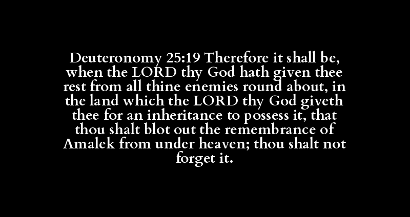 Deuteronomy 25:19 Therefore it shall be, when the LORD thy God hath given thee rest from all thine enemies round about, in the land which the LORD thy God giveth thee for an inheritance to possess it, that thou shalt blot out the remembrance of Amalek from under heaven; thou shalt not forget it.