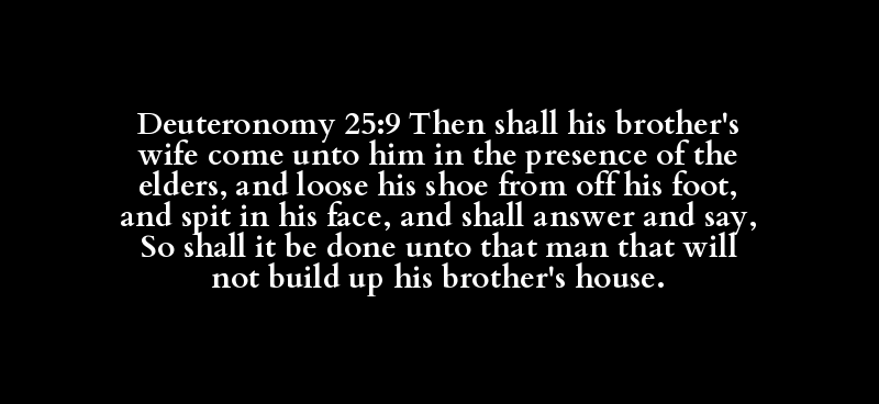 Deuteronomy 25:9 Then shall his brother's wife come unto him in the presence of the elders, and loose his shoe from off his foot, and spit in his face, and shall answer and say, So shall it be done unto that man that will not build up his brother's house.