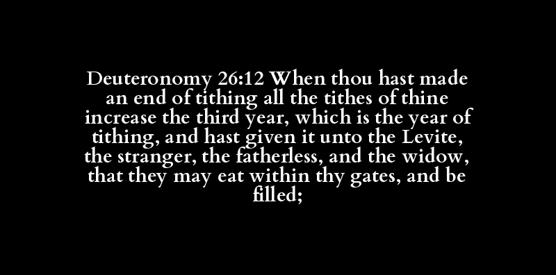 Deuteronomy 26:12 When thou hast made an end of tithing all the tithes of thine increase the third year, which is the year of tithing, and hast given it unto the Levite, the stranger, the fatherless, and the widow, that they may eat within thy gates, and be filled;