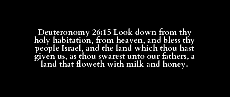 Deuteronomy 26:15 Look down from thy holy habitation, from heaven, and bless thy people Israel, and the land which thou hast given us, as thou swarest unto our fathers, a land that floweth with milk and honey.