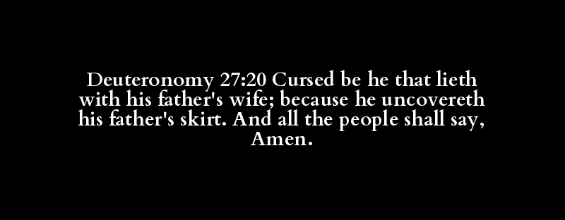 Deuteronomy 27:20 Cursed be he that lieth with his father's wife; because he uncovereth his father's skirt. And all the people shall say, Amen.