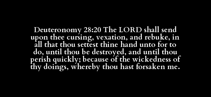 Deuteronomy 28:20 The LORD shall send upon thee cursing, vexation, and rebuke, in all that thou settest thine hand unto for to do, until thou be destroyed, and until thou perish quickly; because of the wickedness of thy doings, whereby thou hast forsaken me.