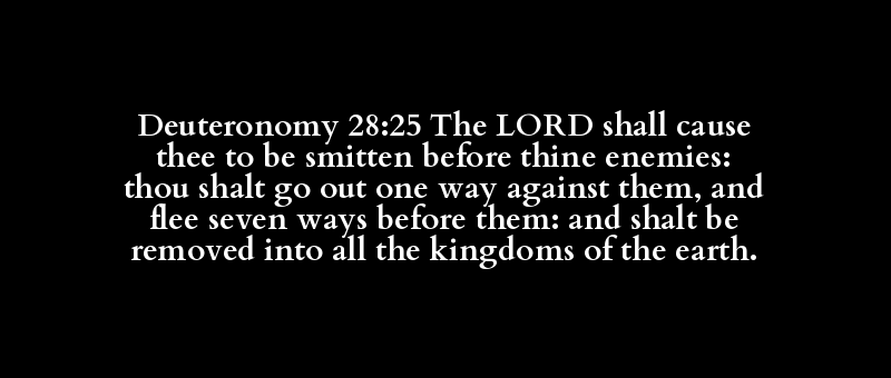 Deuteronomy 28:25 The LORD shall cause thee to be smitten before thine enemies: thou shalt go out one way against them, and flee seven ways before them: and shalt be removed into all the kingdoms of the earth.