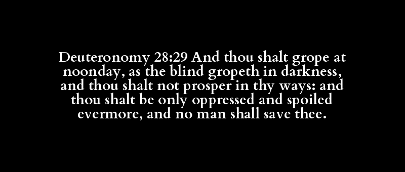 Deuteronomy 28:29 And thou shalt grope at noonday, as the blind gropeth in darkness, and thou shalt not prosper in thy ways: and thou shalt be only oppressed and spoiled evermore, and no man shall save thee.