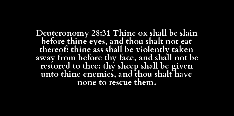 Deuteronomy 28:31 Thine ox shall be slain before thine eyes, and thou shalt not eat thereof: thine ass shall be violently taken away from before thy face, and shall not be restored to thee: thy sheep shall be given unto thine enemies, and thou shalt have none to rescue them.