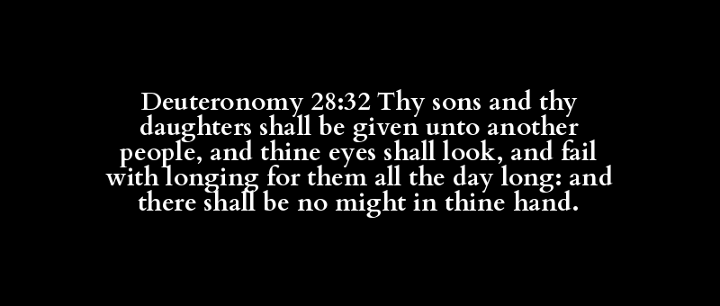 Deuteronomy 28:32 Thy sons and thy daughters shall be given unto another people, and thine eyes shall look, and fail with longing for them all the day long: and there shall be no might in thine hand.