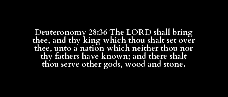 Deuteronomy 28:36 The LORD shall bring thee, and thy king which thou shalt set over thee, unto a nation which neither thou nor thy fathers have known; and there shalt thou serve other gods, wood and stone.