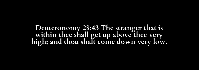 Deuteronomy 28:43 The stranger that is within thee shall get up above thee very high; and thou shalt come down very low.