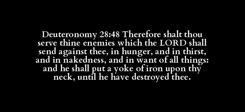Deuteronomy 28:48 Therefore shalt thou serve thine enemies which the LORD shall send against thee, in hunger, and in thirst, and in nakedness, and in want of all things: and he shall put a yoke of iron upon thy neck, until he have destroyed thee.