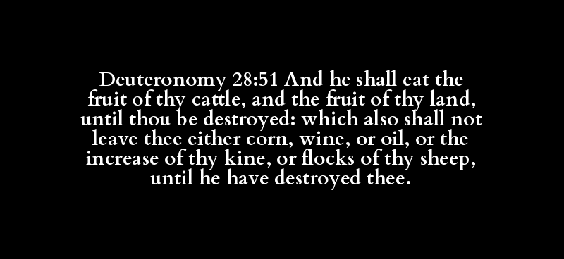 Deuteronomy 28:51 And he shall eat the fruit of thy cattle, and the fruit of thy land, until thou be destroyed: which also shall not leave thee either corn, wine, or oil, or the increase of thy kine, or flocks of thy sheep, until he have destroyed thee.