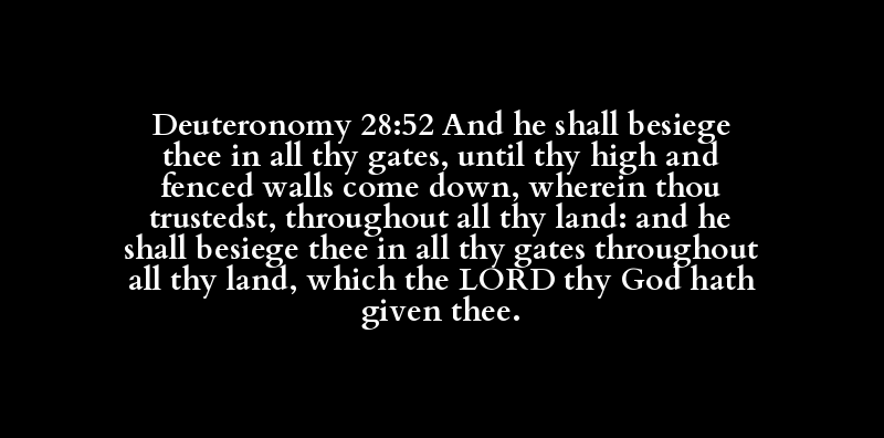 Deuteronomy 28:52 And he shall besiege thee in all thy gates, until thy high and fenced walls come down, wherein thou trustedst, throughout all thy land: and he shall besiege thee in all thy gates throughout all thy land, which the LORD thy God hath given thee.