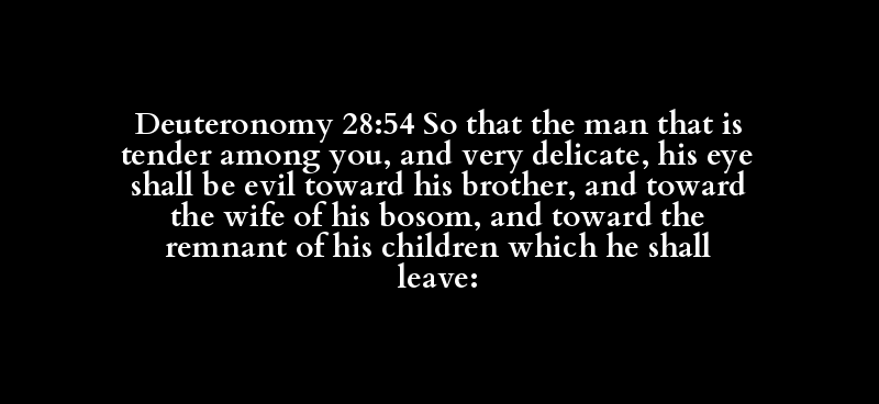Deuteronomy 28:54 So that the man that is tender among you, and very delicate, his eye shall be evil toward his brother, and toward the wife of his bosom, and toward the remnant of his children which he shall leave: