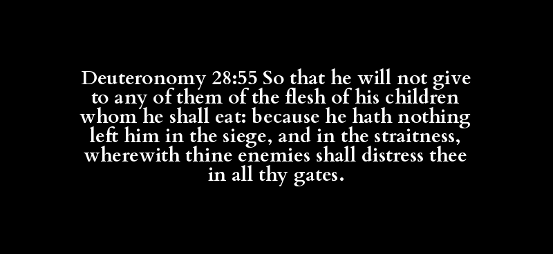 Deuteronomy 28:55 So that he will not give to any of them of the flesh of his children whom he shall eat: because he hath nothing left him in the siege, and in the straitness, wherewith thine enemies shall distress thee in all thy gates.