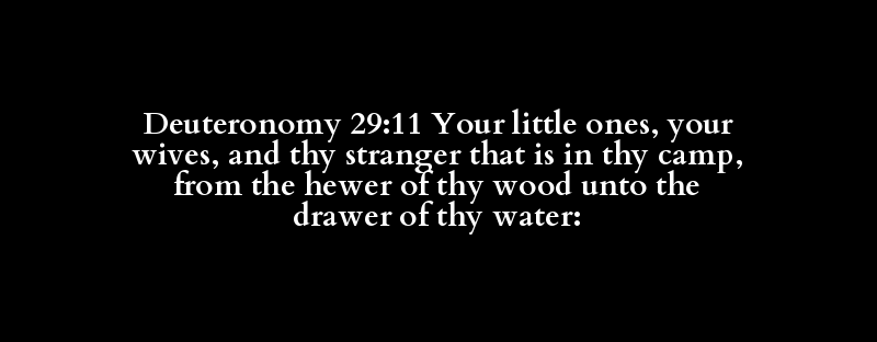 Deuteronomy 29:11 Your little ones, your wives, and thy stranger that is in thy camp, from the hewer of thy wood unto the drawer of thy water: