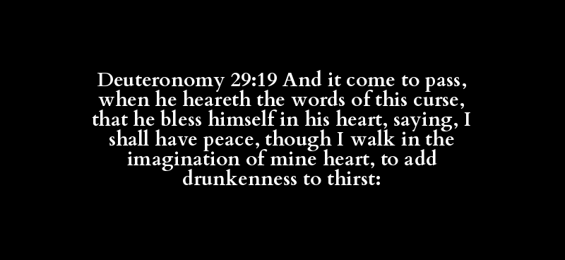 Deuteronomy 29:19 And it come to pass, when he heareth the words of this curse, that he bless himself in his heart, saying, I shall have peace, though I walk in the imagination of mine heart, to add drunkenness to thirst:
