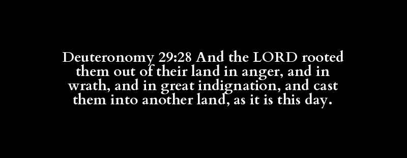 Deuteronomy 29:28 And the LORD rooted them out of their land in anger, and in wrath, and in great indignation, and cast them into another land, as it is this day.