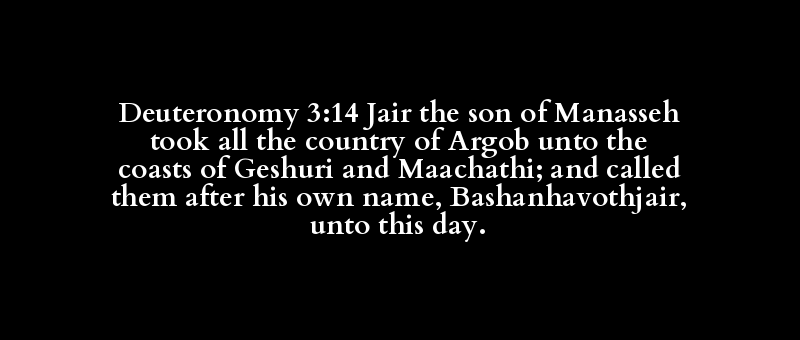 Deuteronomy 3:14 Jair the son of Manasseh took all the country of Argob unto the coasts of Geshuri and Maachathi; and called them after his own name, Bashanhavothjair, unto this day.