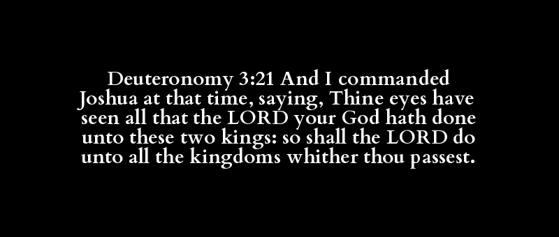 Deuteronomy 3:21 And I commanded Joshua at that time, saying, Thine eyes have seen all that the LORD your God hath done unto these two kings: so shall the LORD do unto all the kingdoms whither thou passest.