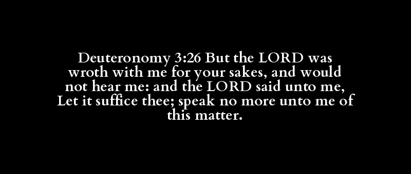 Deuteronomy 3:26 But the LORD was wroth with me for your sakes, and would not hear me: and the LORD said unto me, Let it suffice thee; speak no more unto me of this matter.