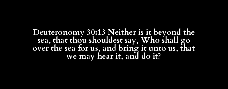 Deuteronomy 30:13 Neither is it beyond the sea, that thou shouldest say, Who shall go over the sea for us, and bring it unto us, that we may hear it, and do it?