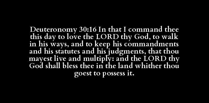Deuteronomy 30:16 In that I command thee this day to love the LORD thy God, to walk in his ways, and to keep his commandments and his statutes and his judgments, that thou mayest live and multiply: and the LORD thy God shall bless thee in the land whither thou goest to possess it.