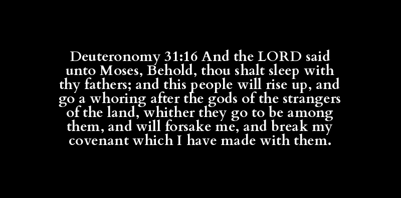 Deuteronomy 31:16 And the LORD said unto Moses, Behold, thou shalt sleep with thy fathers; and this people will rise up, and go a whoring after the gods of the strangers of the land, whither they go to be among them, and will forsake me, and break my covenant which I have made with them.