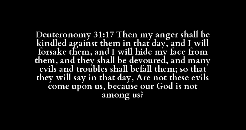 Deuteronomy 31:17 Then my anger shall be kindled against them in that day, and I will forsake them, and I will hide my face from them, and they shall be devoured, and many evils and troubles shall befall them; so that they will say in that day, Are not these evils come upon us, because our God is not among us?