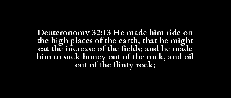 Deuteronomy 32:13 He made him ride on the high places of the earth, that he might eat the increase of the fields; and he made him to suck honey out of the rock, and oil out of the flinty rock;