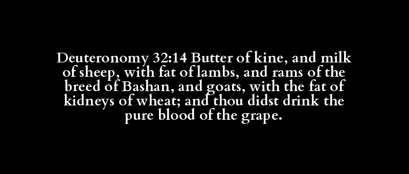 Deuteronomy 32:14 Butter of kine, and milk of sheep, with fat of lambs, and rams of the breed of Bashan, and goats, with the fat of kidneys of wheat; and thou didst drink the pure blood of the grape.