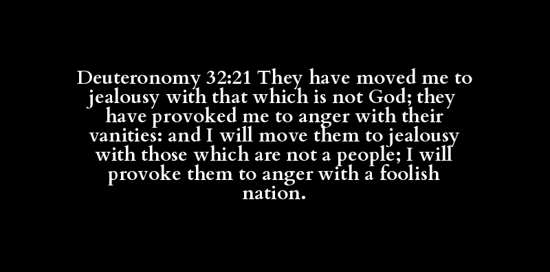 Deuteronomy 32:21 They have moved me to jealousy with that which is not God; they have provoked me to anger with their vanities: and I will move them to jealousy with those which are not a people; I will provoke them to anger with a foolish nation.