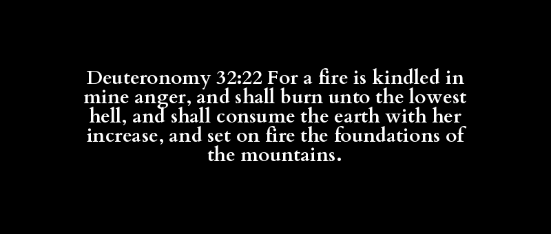 Deuteronomy 32:22 For a fire is kindled in mine anger, and shall burn unto the lowest hell, and shall consume the earth with her increase, and set on fire the foundations of the mountains.