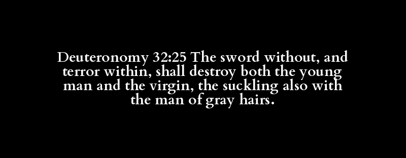Deuteronomy 32:25 The sword without, and terror within, shall destroy both the young man and the virgin, the suckling also with the man of gray hairs.