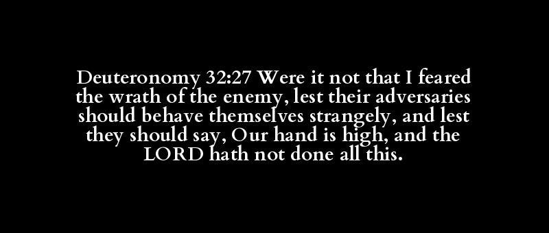 Deuteronomy 32:27 Were it not that I feared the wrath of the enemy, lest their adversaries should behave themselves strangely, and lest they should say, Our hand is high, and the LORD hath not done all this.