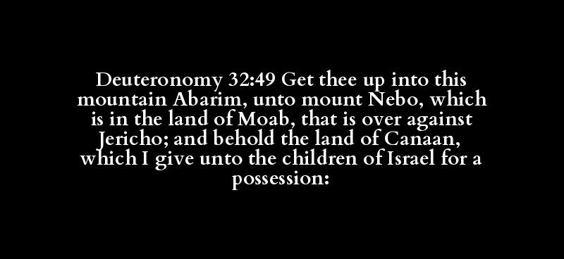 Deuteronomy 32:49 Get thee up into this mountain Abarim, unto mount Nebo, which is in the land of Moab, that is over against Jericho; and behold the land of Canaan, which I give unto the children of Israel for a possession: