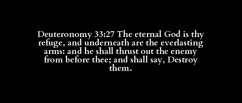Deuteronomy 33:27 The eternal God is thy refuge, and underneath are the everlasting arms: and he shall thrust out the enemy from before thee; and shall say, Destroy them.