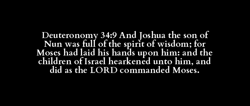 Deuteronomy 34:9 And Joshua the son of Nun was full of the spirit of wisdom; for Moses had laid his hands upon him: and the children of Israel hearkened unto him, and did as the LORD commanded Moses.