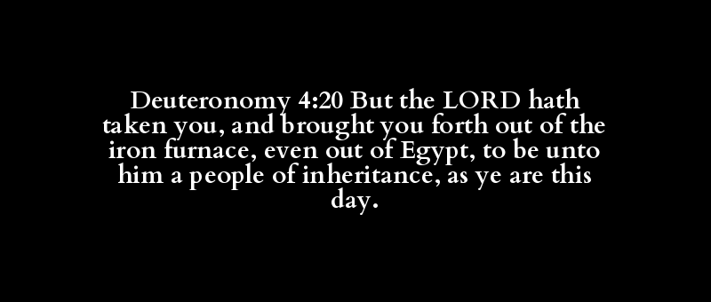Deuteronomy 4:20 But the LORD hath taken you, and brought you forth out of the iron furnace, even out of Egypt, to be unto him a people of inheritance, as ye are this day.