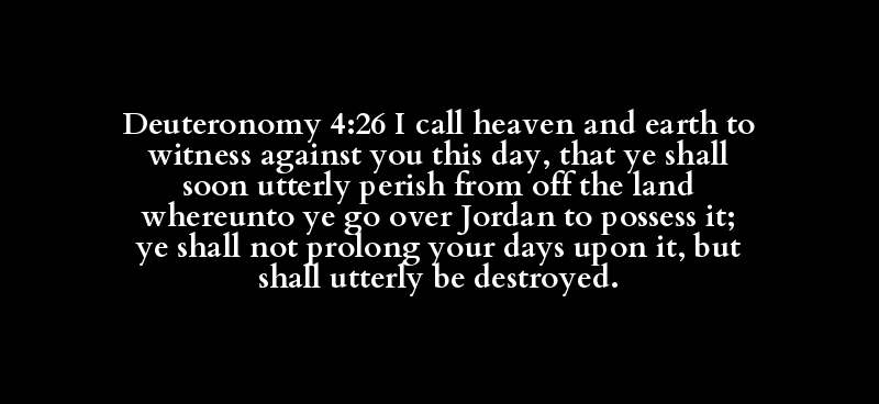 Deuteronomy 4:26 I call heaven and earth to witness against you this day, that ye shall soon utterly perish from off the land whereunto ye go over Jordan to possess it; ye shall not prolong your days upon it, but shall utterly be destroyed.