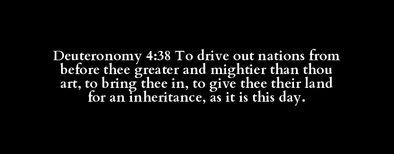 Deuteronomy 4:38 To drive out nations from before thee greater and mightier than thou art, to bring thee in, to give thee their land for an inheritance, as it is this day.