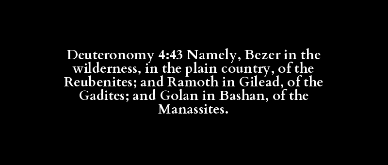 Deuteronomy 4:43 Namely, Bezer in the wilderness, in the plain country, of the Reubenites; and Ramoth in Gilead, of the Gadites; and Golan in Bashan, of the Manassites.