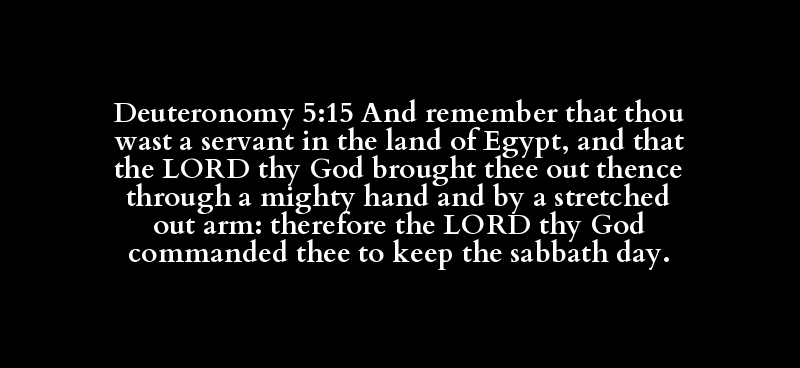 Deuteronomy 5:15 And remember that thou wast a servant in the land of Egypt, and that the LORD thy God brought thee out thence through a mighty hand and by a stretched out arm: therefore the LORD thy God commanded thee to keep the sabbath day.