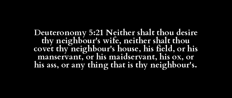 Deuteronomy 5:21 Neither shalt thou desire thy neighbour's wife, neither shalt thou covet thy neighbour's house, his field, or his manservant, or his maidservant, his ox, or his ass, or any thing that is thy neighbour's.