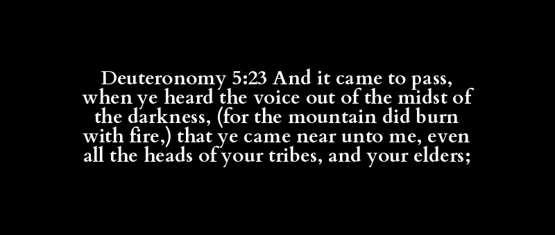 Deuteronomy 5:23 And it came to pass, when ye heard the voice out of the midst of the darkness, (for the mountain did burn with fire,) that ye came near unto me, even all the heads of your tribes, and your elders;