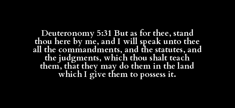 Deuteronomy 5:31 But as for thee, stand thou here by me, and I will speak unto thee all the commandments, and the statutes, and the judgments, which thou shalt teach them, that they may do them in the land which I give them to possess it.