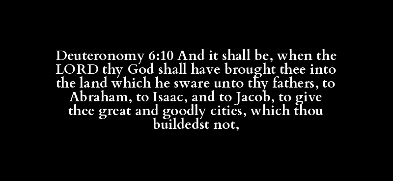 Deuteronomy 6:10 And it shall be, when the LORD thy God shall have brought thee into the land which he sware unto thy fathers, to Abraham, to Isaac, and to Jacob, to give thee great and goodly cities, which thou buildedst not,