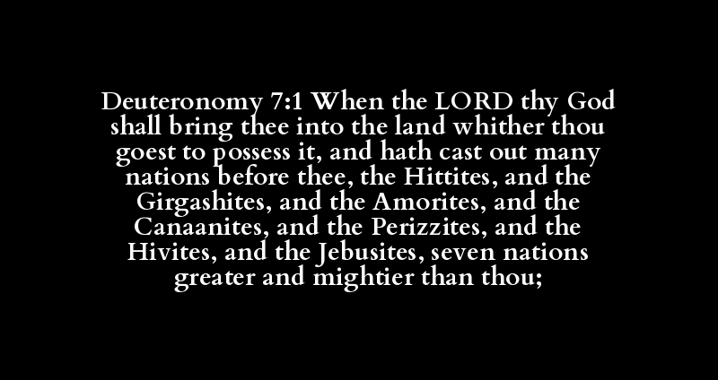 Deuteronomy 7:1 When the LORD thy God shall bring thee into the land whither thou goest to possess it, and hath cast out many nations before thee, the Hittites, and the Girgashites, and the Amorites, and the Canaanites, and the Perizzites, and the Hivites, and the Jebusites, seven nations greater and mightier than thou;