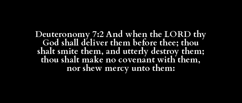 Deuteronomy 7:2 And when the LORD thy God shall deliver them before thee; thou shalt smite them, and utterly destroy them; thou shalt make no covenant with them, nor shew mercy unto them: